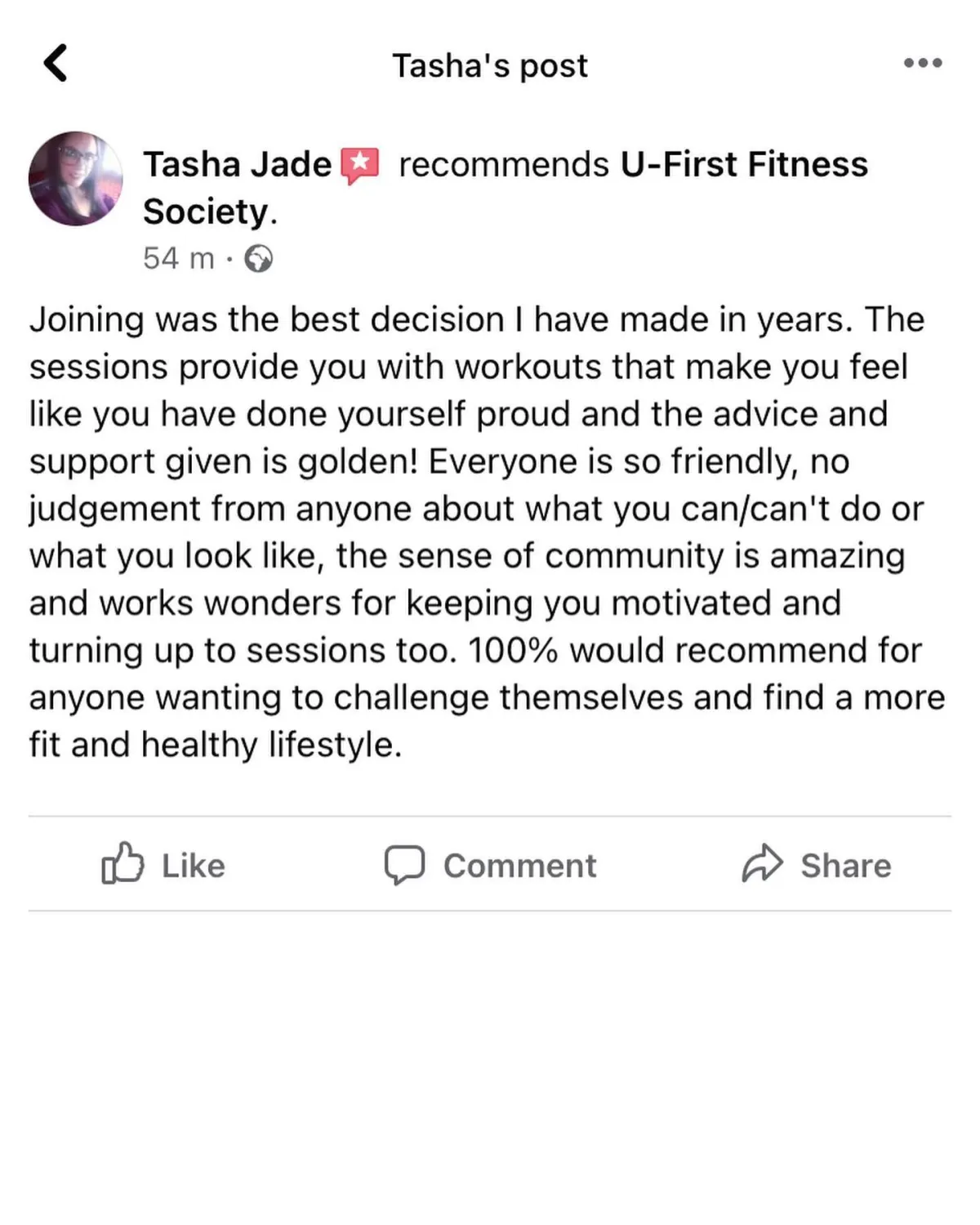 U-First Fitness Society was founded in 2018 by Antony Tucker and Sarah-Jane Broderick, a bodybuilding couple, fully qualified level 3 personal trainers & nutritionists and all round fitness fanatics. Antony and Sarah-Jane became frustrated with the fitness industry and the ever increasing prices to gain access to quality health and fitness services and wanted to come up with an alternative to expensive gym memberships, pricey PT & nutritionist sessions and over complicated approaches to becoming healthier, happier and fitter.Their answer? To create an affordable way for local people to become the best versions of themselves. Antony and Sarah-Jane believe that everyone should have access to quality health advice, training and nutritional guidance.U-First Fitness Society aims to bring together communities of like-minded people all chasing similar goals, all whilst still receiving all the perks of having your very own personal trainer & nutritionist at a fraction of the cost.No matter your goal, U-First Fitness Society can help. We don't shy away from any challenge, no matter how big or small.Antony and Sarah-Jane believe in sustainability and long term adherence, rather than quick fixes and fast transformations that people are unable to stick with and maintain. U-First aims to educate their members to allow them to change their lifestyle for the better